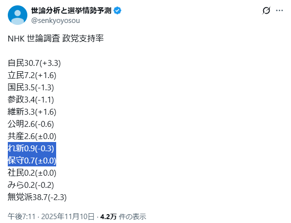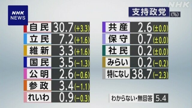 #政党支持率 自民30.7% 内閣発足時では低水準 NHK世論調査 | NHKニュース 【NHK】11月の各党の支持率です。 「2012年12月に自民党が政権復帰して以降、内閣発足時の党の支持率は...高市内閣ではいずれの内閣よりも低い水準となっています。」 news.web.nhk/newsweb/na/na-…