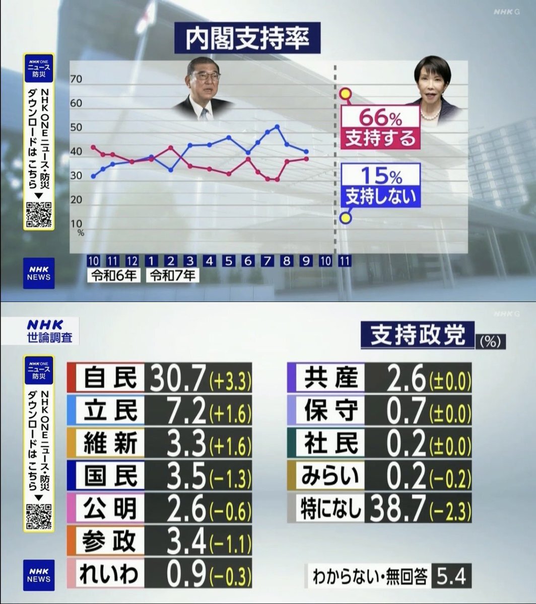 【NHKの世論調査】10月に発足した高市内閣を「支持する」は66%、「支持しない」と答えた人は15%。 政党支持率は、自民党が30.7%、立憲民主党が7.2%、特に支持している政党はないが38.7%。