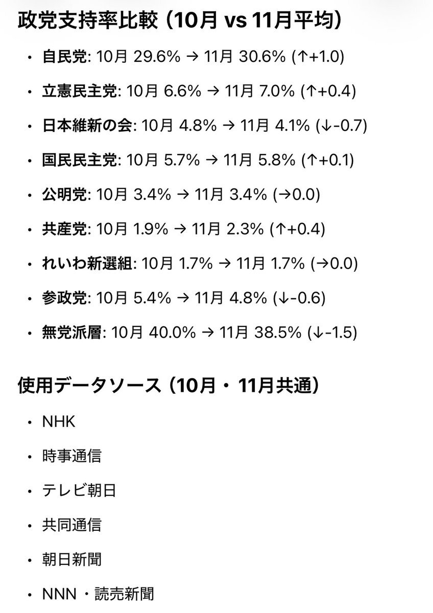 各報道機関の政党支持率が毎回バラバラすぎるので、単純な平均値が知りたくてGrok先生に依頼 【結果発表】 先月⇒今月でどの政党もあまり変化なしの模様🤔 #政党支持率 #世論調査 pic.x.com/4Dr0IaM5Ei