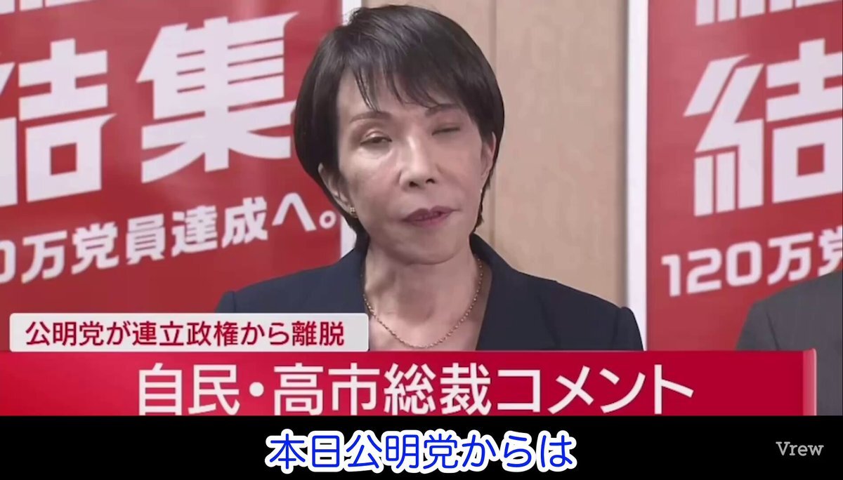 高市総裁 「公明党から政治資金規正法の改正に関する公明党案について、この場で賛否を示すように求められた。 当然党内手続きが必要なため持ち帰り、速やかに対応・回答したいと申し上げたが、先方からは『それは具体的な回答ではない』ということで一方的に連立政権からの離脱を伝えられた」
