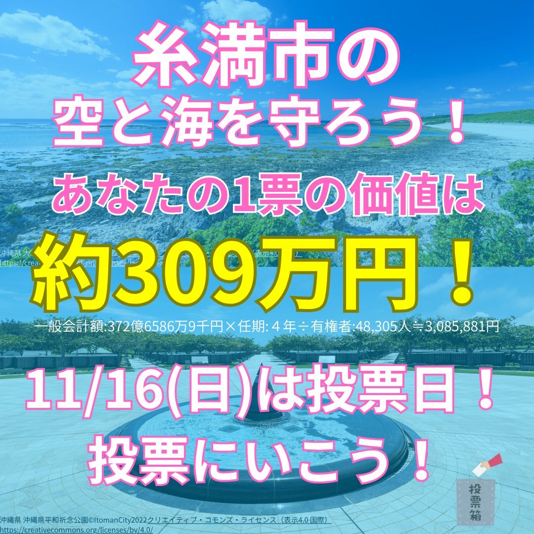 まだまだ覚醒が足りてません(;・∀・) 糸満市の皆様!明日は市議会議員選挙の投票日です! 糸満市の1票の重さは約309万円もの税金の使い道に相当します!投票はすぐ終わるのに、投票しないなんてもったいない! 明日16日(日)は投票に行きましょう! #糸満市 #市議会議員選挙 #政治に参加しよう! pic.x.com/q2MkpKFXLN