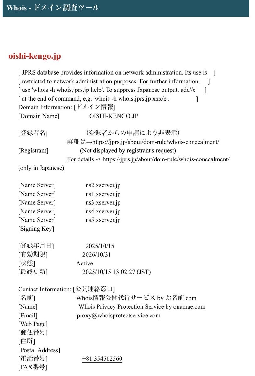 このHP、10/15とつい最近の制作やね WHOISで調べてみたら、お名前ドットコムのWhois情報公開代行サービスを使って登録者情報が隠されてる 知事がそんなもの隠す必要がある?🤔 #長崎県知事選 #大石賢吾 #政治資金問題 pic.x.com/ePWZzwbKOP x.com/oishikengo/sta…