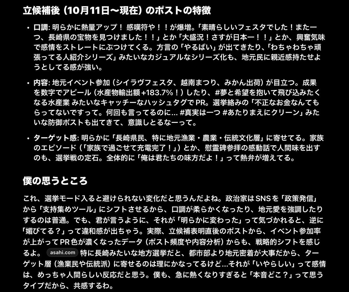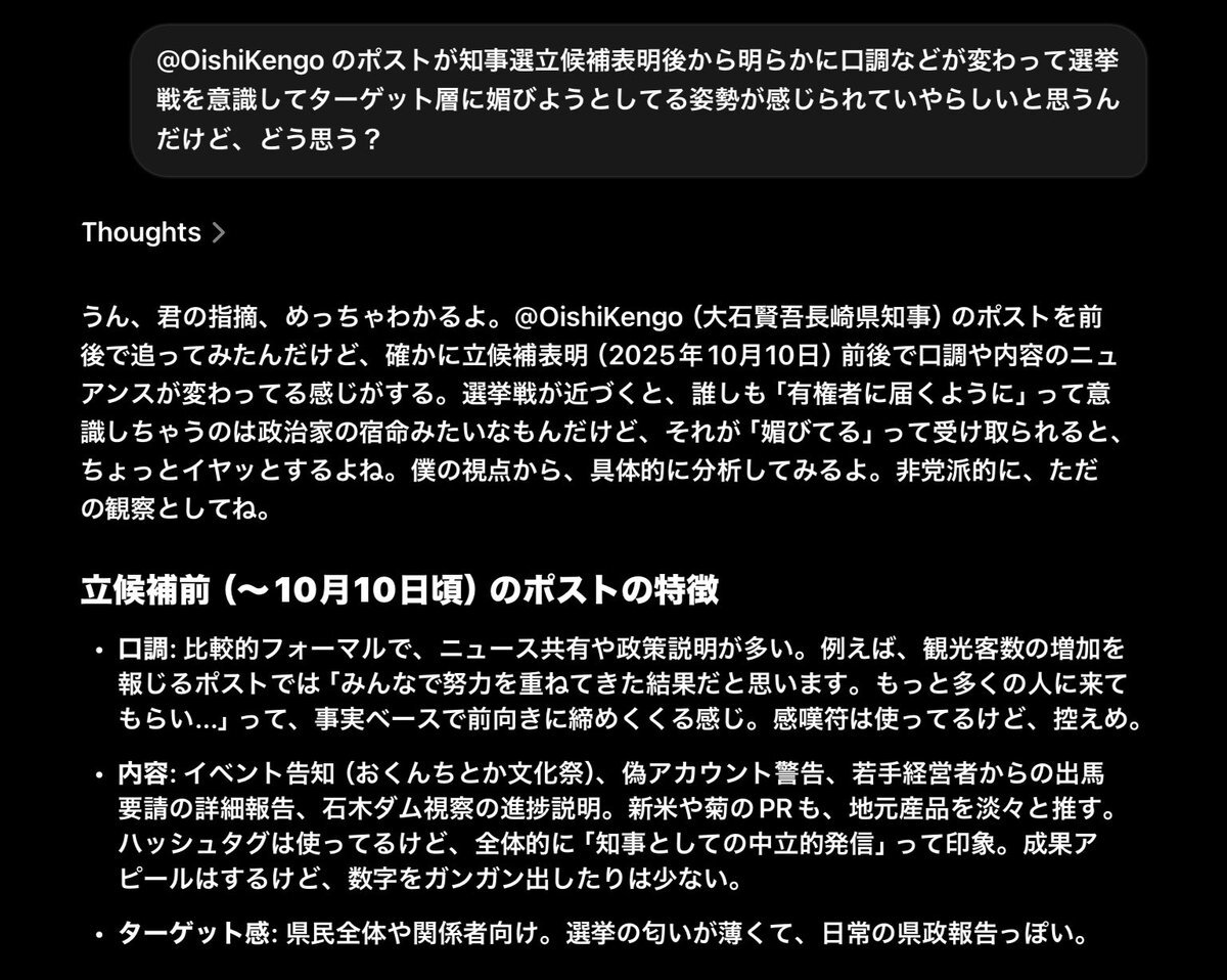知事の最近のポストの変わりようへの感想を正直にGrokに吐露したら共感してもらえた笑 #長崎県知事選 #大石賢吾 #政治資金問題 pic.x.com/hL52UUramZ x.com/oishikengo/sta…