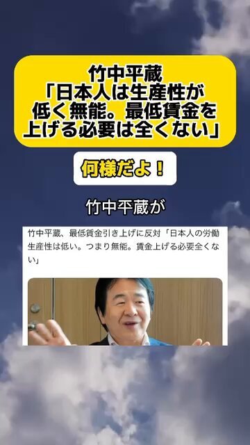 竹中平蔵「日本人は生産性が低く無能。最低賃金を上げる必要は全くない」