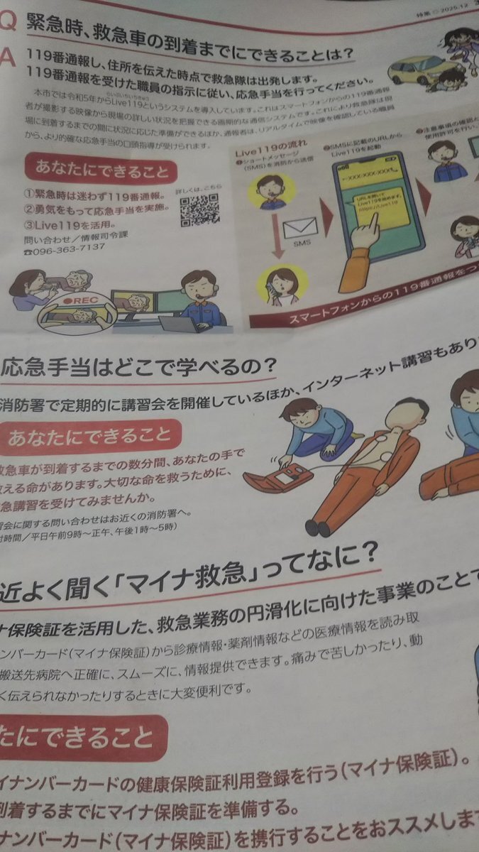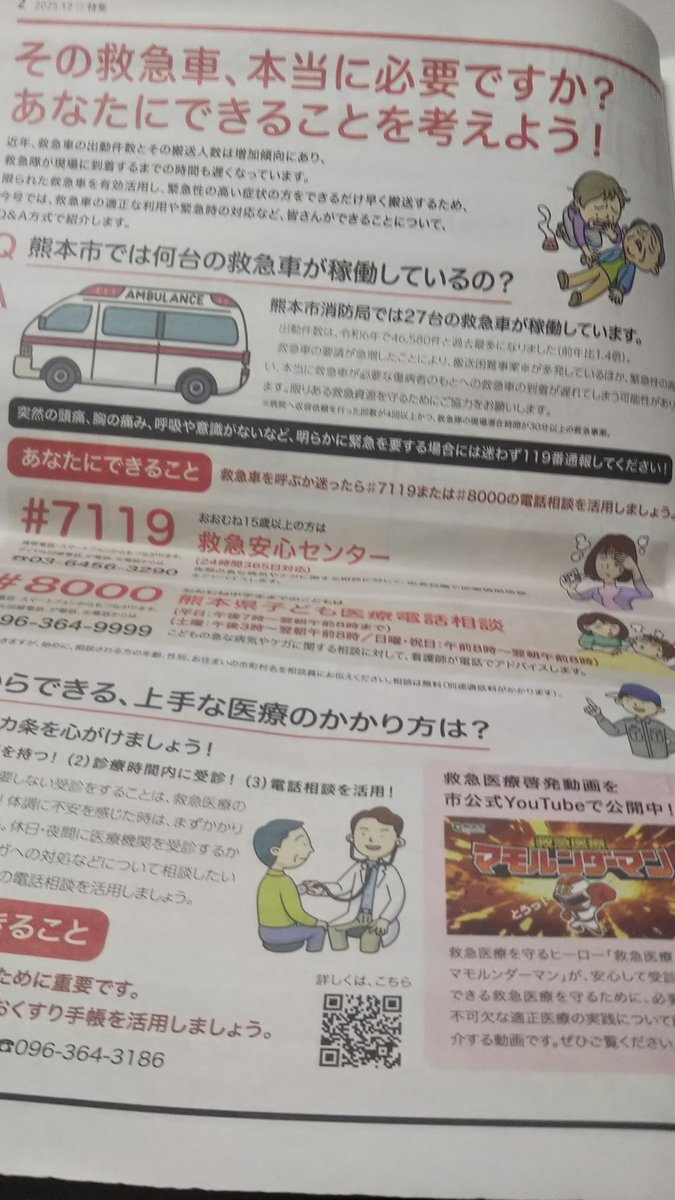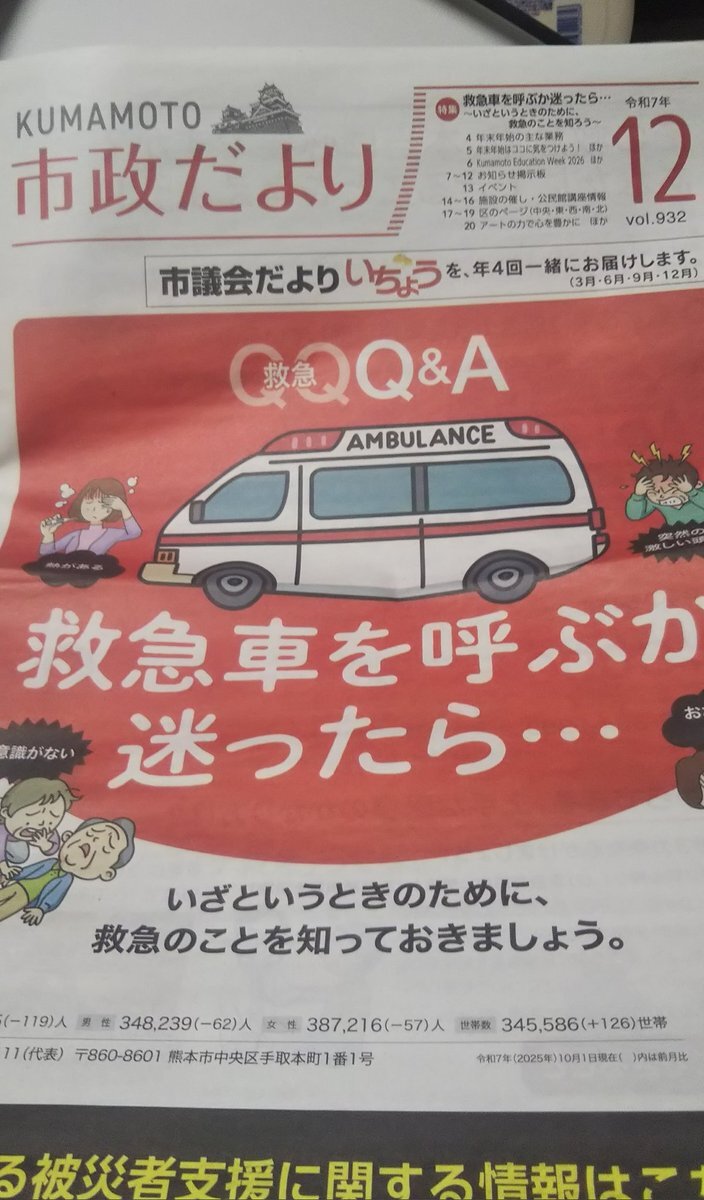 #KUMAMOTO市政だより12 「 #救急車 を呼ぶか迷ったら、、、」いざというときのために 救急のことを知っておきましょう 私の #質問に関連 した掲載になりました pic.x.com/8Bp2QWInt6