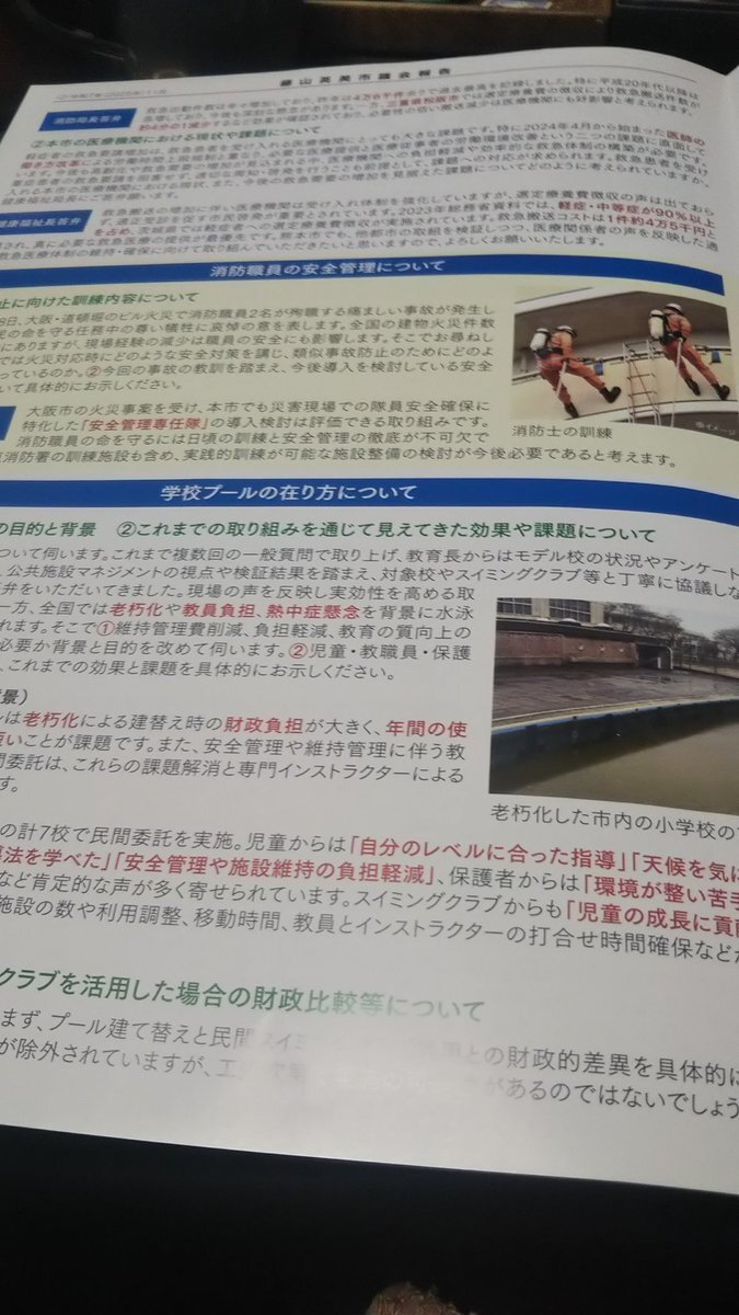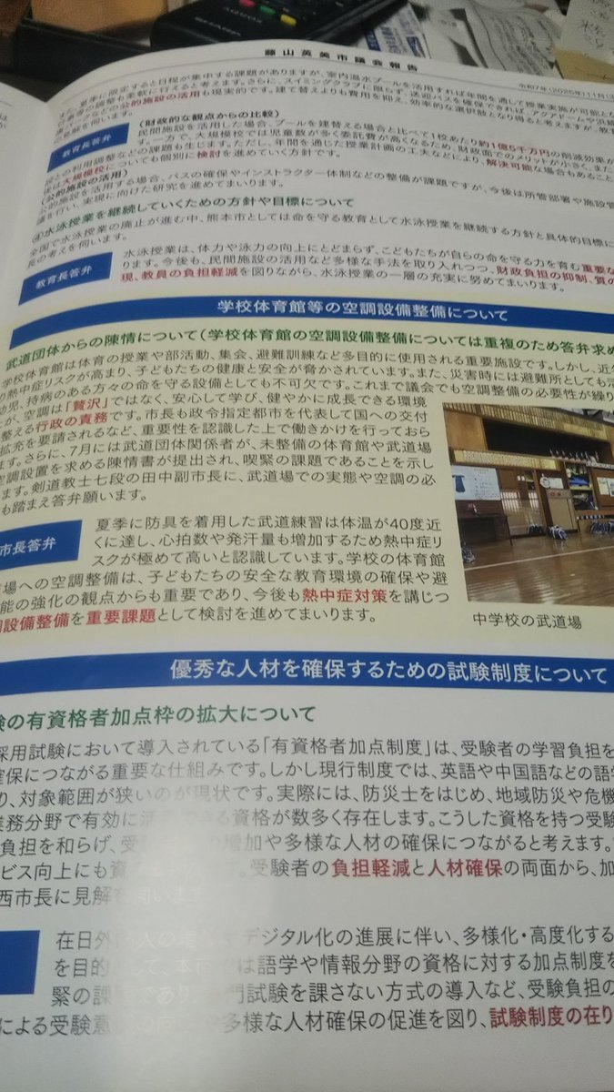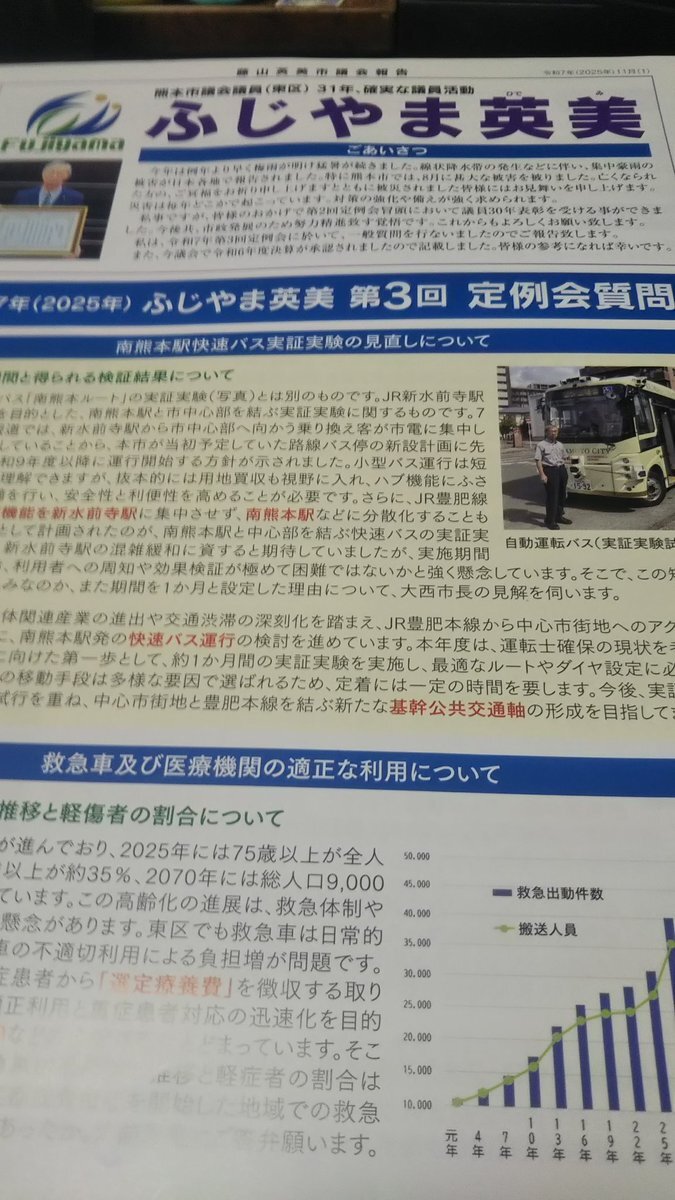 令和7年ふじやま英美 第三回定例会質問の報告 ①南熊本駅快速バス実証実験の見直しについて② #救急車 及び医療機関の適正な利用について③消防職員の安全確認について④ #学校プール の在り方について⑤ #学校体育館等の空調設備整備 について⑥優秀な人材を確保するための試験制度について を記載 pic.x.com/f0Ye9nlmhf