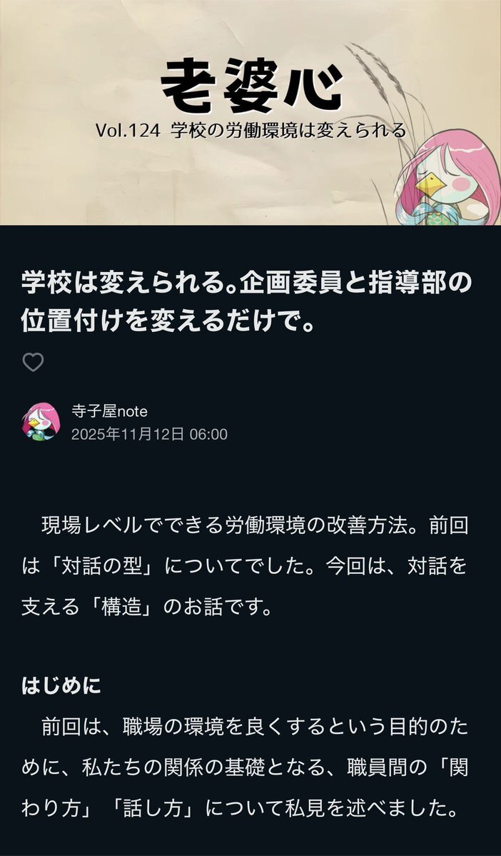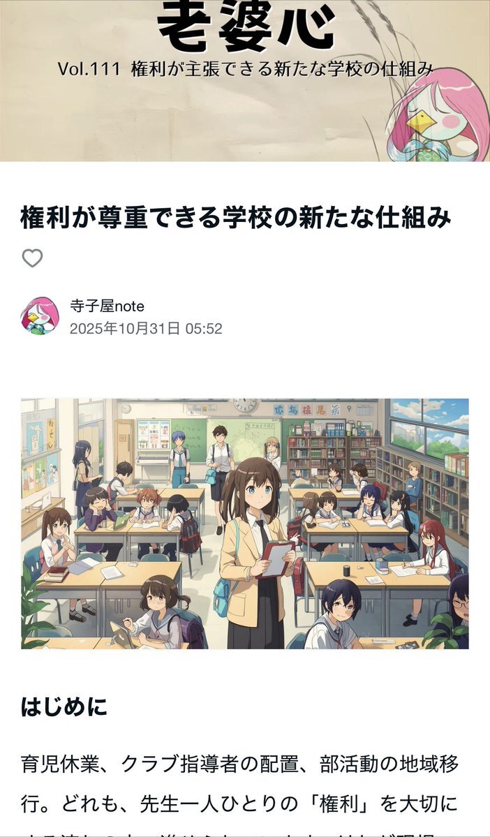 「権利が尊重できる学校」は、どうすれば実現できるのか。 教員の働き方改革を“仕組み”の側から考えました。 AIとジョブ化が見せる、学校の新しい地図。 👉 note.com/vast_iris8176/… #教育 #働き方改革 #教員の働き方 #ジョブ型雇用 #老婆心シリーズ pic.x.com/L5J88KgVpk
