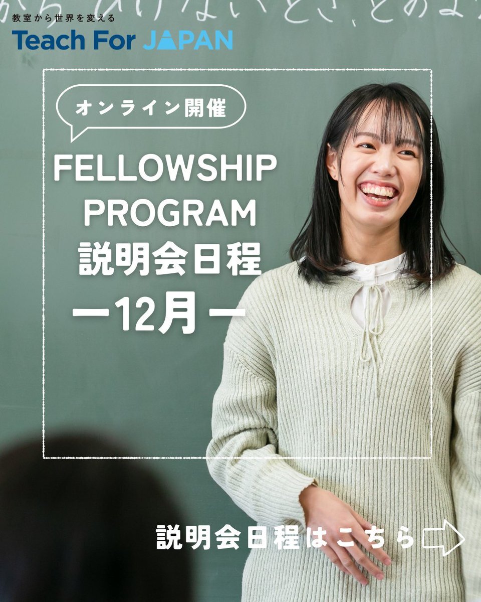 🎓修了生に直接聞ける!少人数オンライン座談会 フェローシップ・プログラム修了生と少人数でじっくり話せる90分。 質問も対話も、ざっくばらんにどうぞ! peatix.com/event/4702089 #教採 #子ども #教室から世界を変える #転職 #教育 #教師 #教室 #teachforjapan #教員 #ペーパーティーチャー