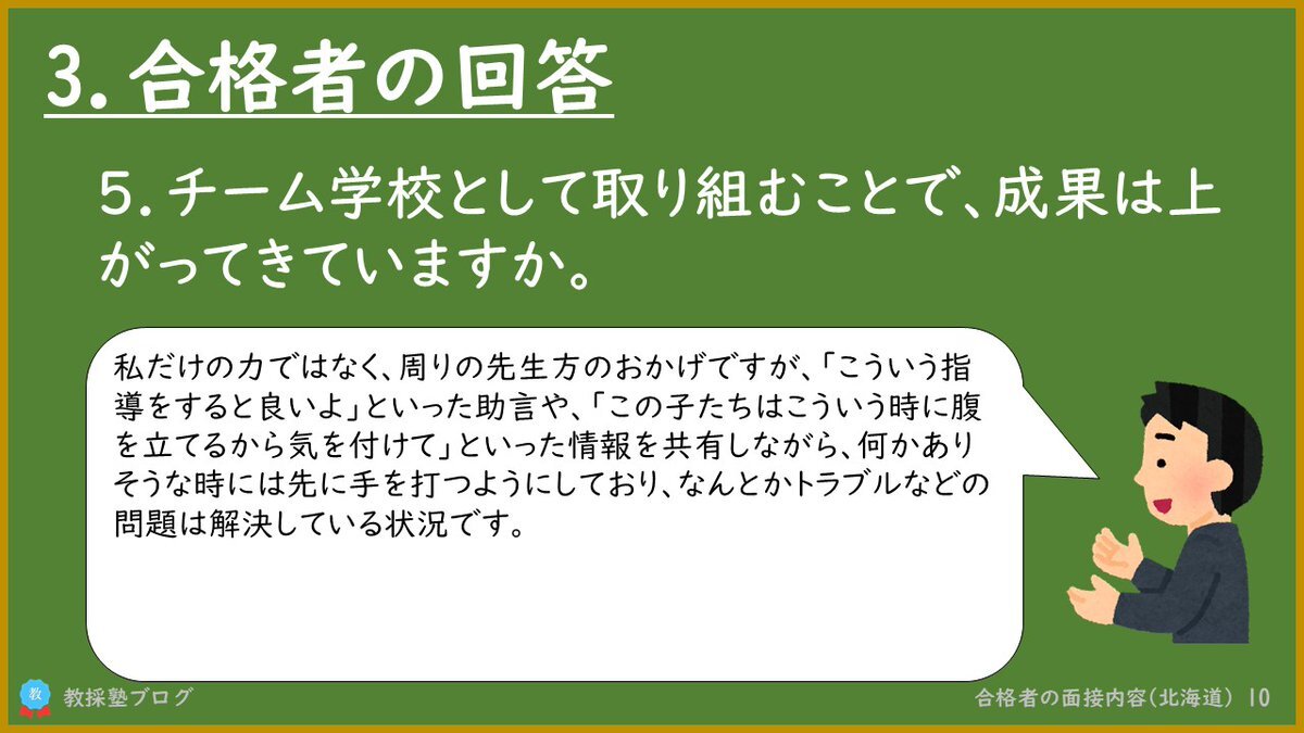 教採に合格した人が面接でどんな質問を受けて、どう答えたのか。その一部を紹介します。 他の回答や他の自治体の合格者の面接内容を知りたい方は10秒だけでもいいのでリプ欄を見てください。 #教採 #教員採用試験 pic.x.com/CsFG3VVJyh