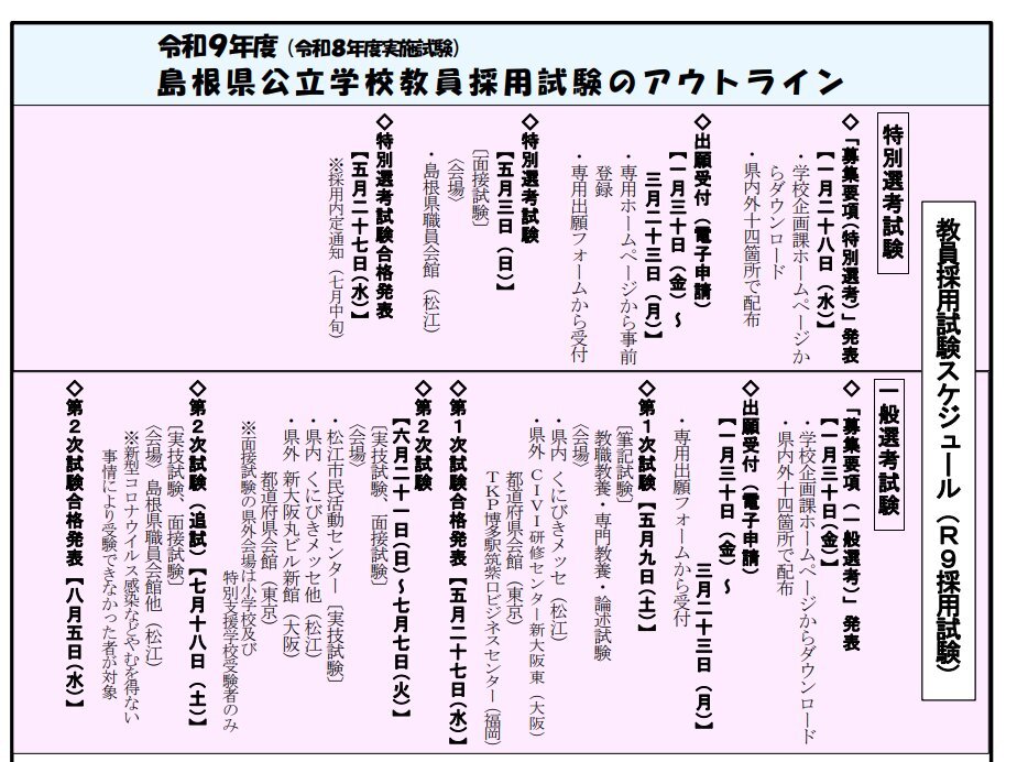 教採の1次は7月、2次は8月。 そんなことはもうありません。 島根県の教採日程 1次→5月 2次→6月 合格発表→8月 ゴールデンウイーク明けから試験です。 #教採 #教員採用試験 pic.x.com/Bwoafku4Pd