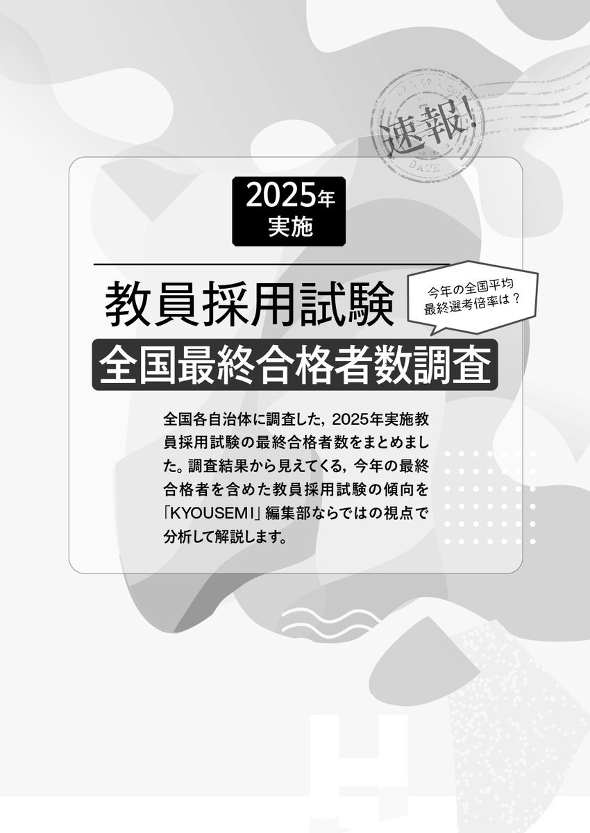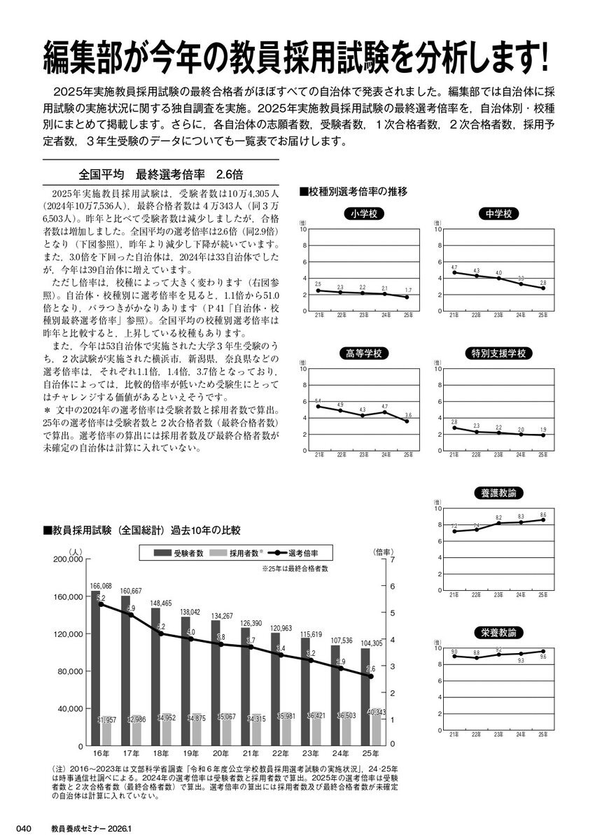 #KYOUSEMI 最新号紹介🫣】 最新のKYOUSEMI1月号では、 2025年に実施された #教採 の合格者数、 そして気になる倍率を一挙掲載しています👀 画像2枚目の全国倍率だけでなく、 全自治体の校種別の倍率も掲載しています📢 2026年の試験に向けた情報収集に! 是非お役立てください!! pic.x.com/K7Ewb0CRGU