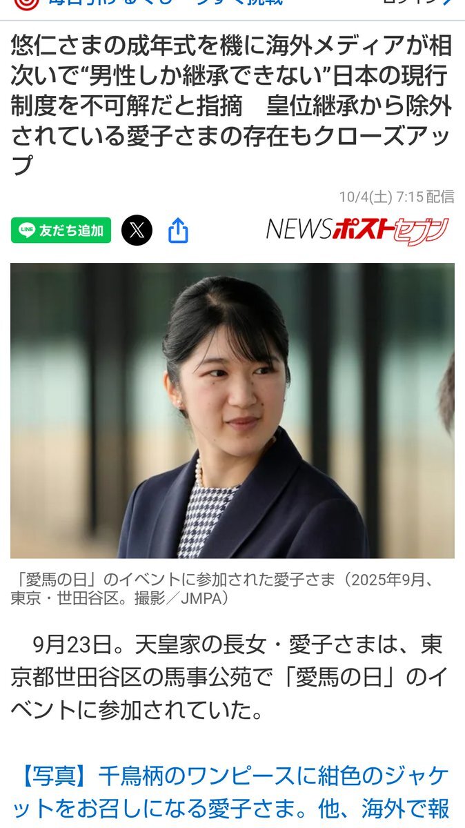 悠仁さまの成年式を機に海外メディアが相次いで“男性しか継承できない”日本の現行制度を不可解だと指摘 皇位継承から除外されている愛子さまの存在もクローズアップ💪✨️#敬宮さま #としのみやさま👑 10/4(土) 7:15配信💖 ⇒#Yahooニュース news.yahoo.co.jp/articles/0d2f0… pic.x.com/TFaCTFlfqu