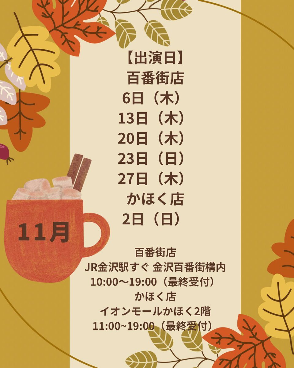 ご案内が遅くなりましたが 11月の出演スケジュールです🔮 皆さまにお会いできるのを 楽しみにしています🥰 #聖結衣 #カードセッション #数理学 pic.x.com/32liOHmTbl
