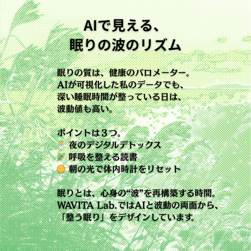 眠りの質は、健康のバロメーター。 AIが可視化した私のデータでも、 深い睡眠時間が整っている日は、波動値も高い。 眠りとは、心身の“波”を再構築する時間。 AIと波動の両面から、 「整う眠り」を体験しませんか? #wavita #波動 #AIウェルビーイング #整う暮らし #生命の波 #sanao #意識の科学 pic.x.com/RSpfsP0jJR