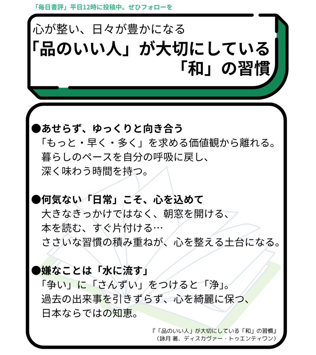 物事に追われる忙しい毎日を再編集 「品のいい人」が実践する「和」の習慣 🍵「もっと・早く・多く」を手放し、あせらずゆっくりと 🌿特別な日でなく、「ささいな日常」こそ心を込めて 💧嫌なことは、さっと「水に流す」 lifehacker.jp/article/2510_b… @discover21 #毎日書評 #整う習慣 pic.x.com/xUVRaFBKvM