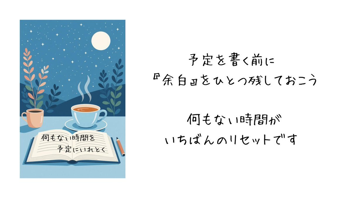 予定を書く時に、 『何もしない時間』を予定しとく。 何もない時間、 その余白が『こころのリセット』に🌿 #整える習慣 #マインドフルネス手帳 pic.x.com/a4omHbRFQY