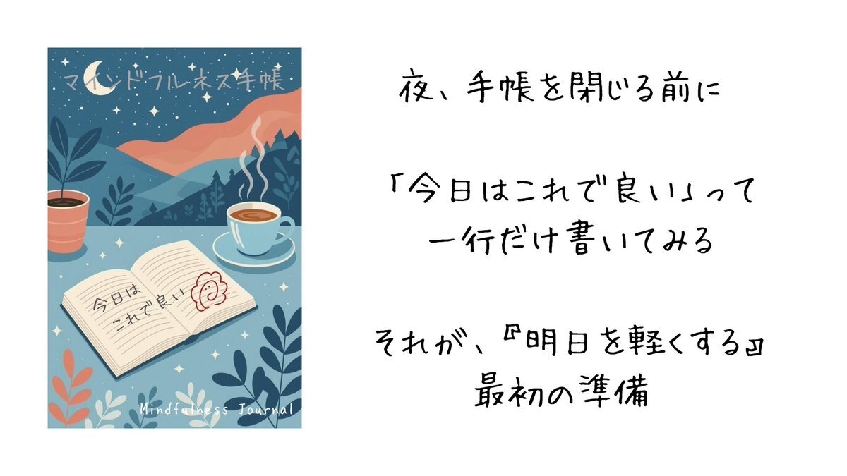 夜は、反省するよりも『整える時間』。 手帳を閉じる前に「今日はこれでよかった」と書いてみてください。 今日1日が満足できるものでなくても、 今日を認める一言で、心はちゃんと休めます🌿 #整える習慣 #マインドフルネス手帳 pic.x.com/jvv3SNk3iK