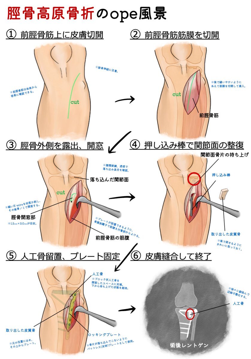 衝撃ope No.5 関節面の落ち込みはなるべく綺麗に整復しないと、将来的な変形性膝関節症のリスクが高まる。 ただ、関節をズル向けにして治すのも良くないので、遠位側から窓を開けて関節面を整復し、人工骨をスペースに入れて維持するのは斬新に感じた。 #脛骨高原骨折 #整形日記 #opeイラスト日記 pic.x.com/rcHgrMqs3A
