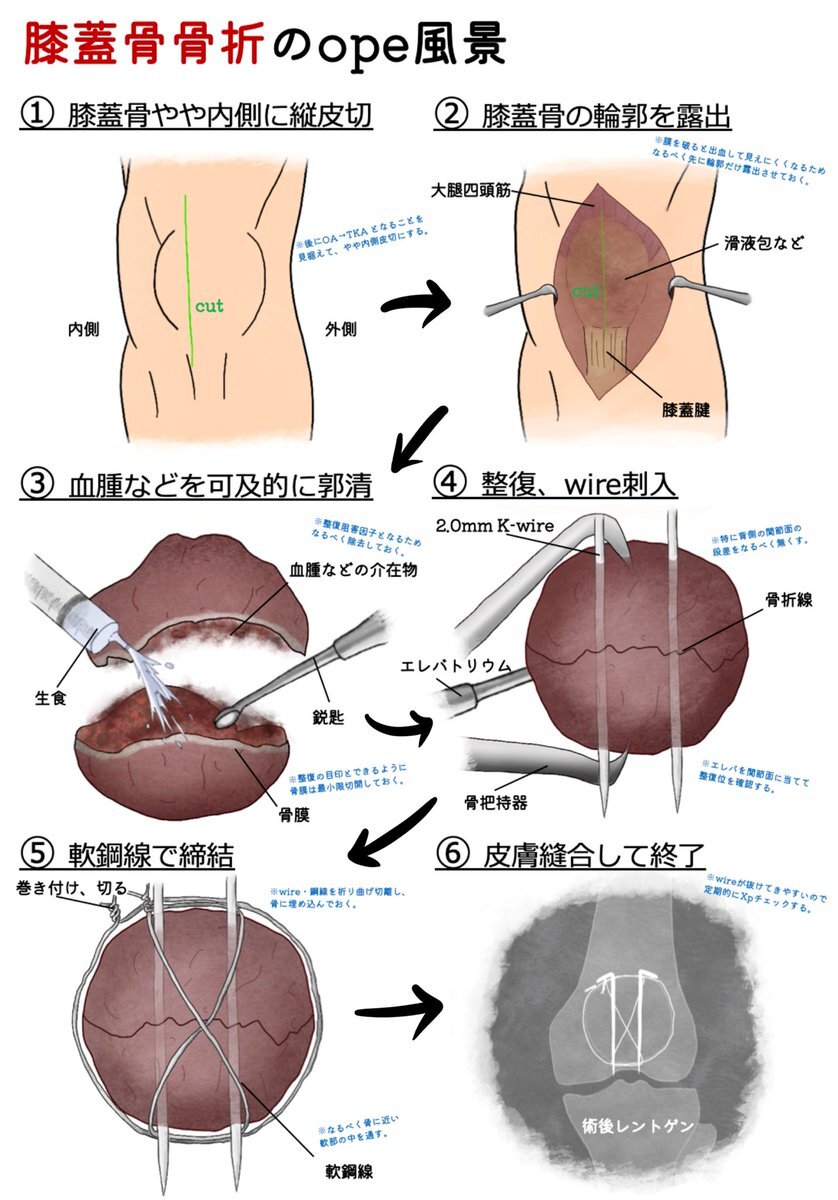膝蓋骨骨折(パテラ骨折)のopeは、解剖学的に怖い神経や血管が出てこないところがいい。 大腿四頭筋と膝蓋腱に引っ張られて、図のようにパックリ折れていることも稀ではない。 今回の一例はテンションバンドワイヤリング法。手術材料費が安いのが特徴。 #膝蓋骨骨折 #整形日記 #opeイラスト日記 pic.x.com/ZNaVFnmYRc