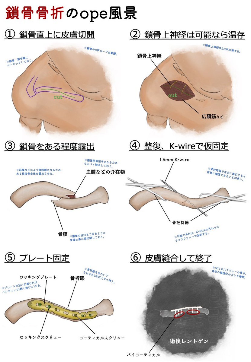 鎖骨骨折のope風景。 鎖骨上神経の温存は意見が分かれるところ。温存したとしても、抜釘の時に損傷することが多い。損傷したとしても、周囲のピリピリ感が出たり、全く症状が出ない人もいる。 僕は、積極的には同定しないけど、見つかったら温存する考え。 #鎖骨骨折 #整形日記 #opeイラスト日記 pic.x.com/tKZun0oAWH