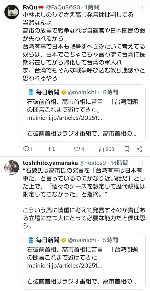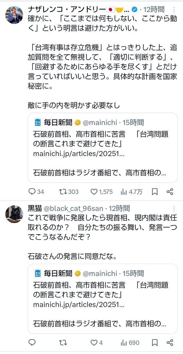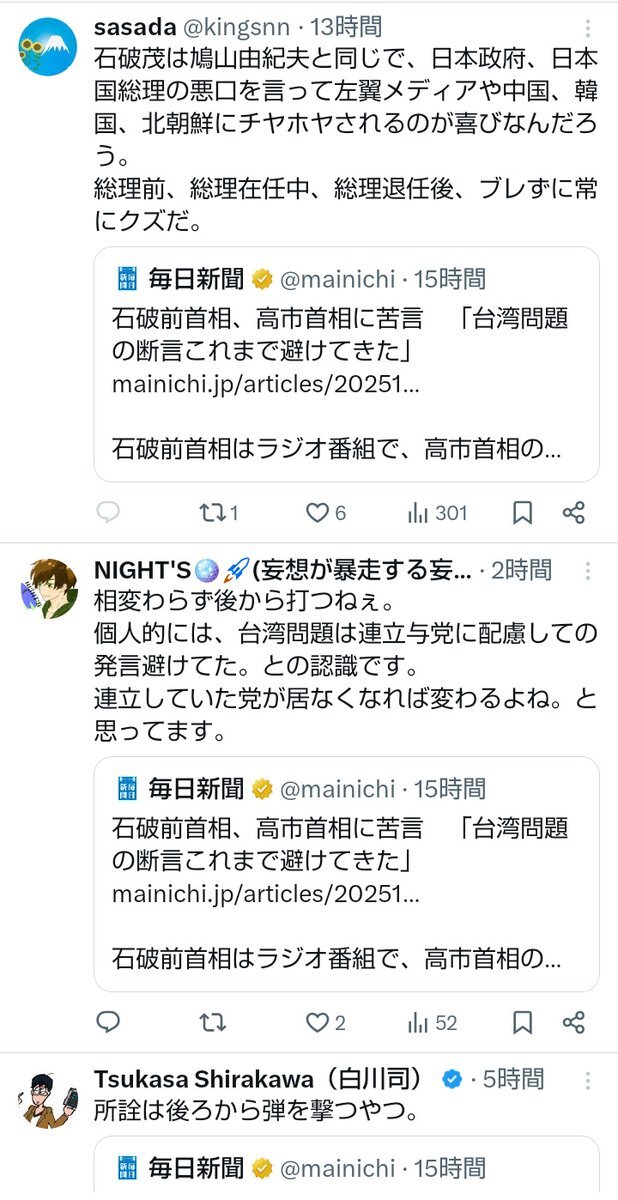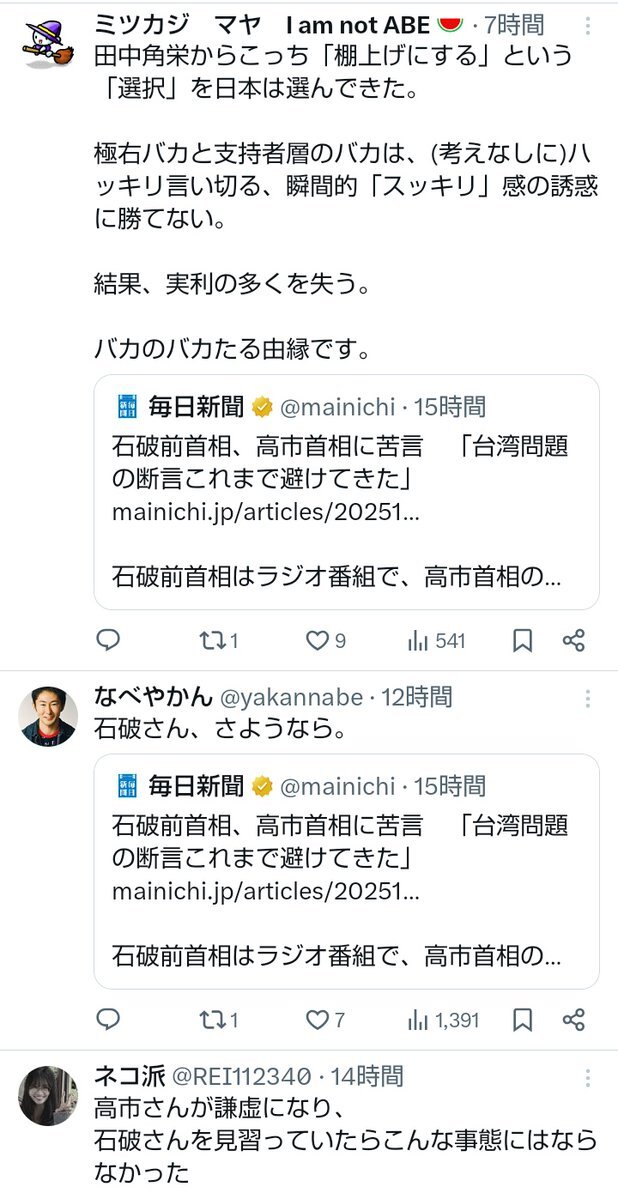 石破前首相、高市首相に苦言 「台湾問題の断言これまで避けてきた」 mainichi.jp/articles/20251… 石破前首相はラジオ番組で、高市首相の答弁について「台湾問題で『この場合はこう』と政府が断定することは、歴代政権が避けてきたことだ」と苦言を呈しました。