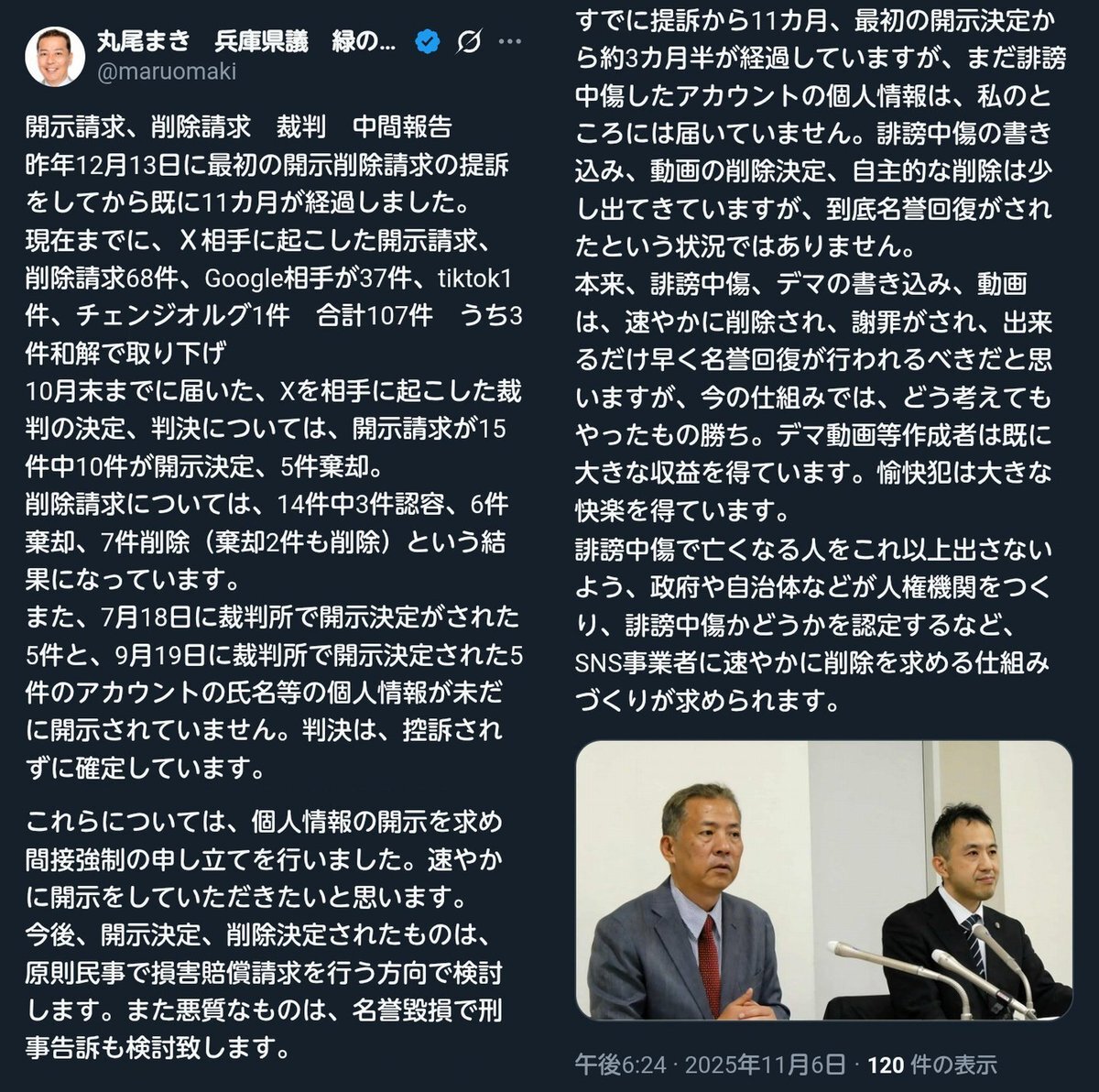 ついさっき㋔さんが牽制するようなポストしてましたね。 長ったらしいのでGrokに100字以内で簡単に要約してもらいました。 以下↓ ______ ネットでウソついた人107人、まるおが「名前教えて!消して!」って裁判したよ。 10人「教えるね!」って決まったのに、まだ教えてくれない。