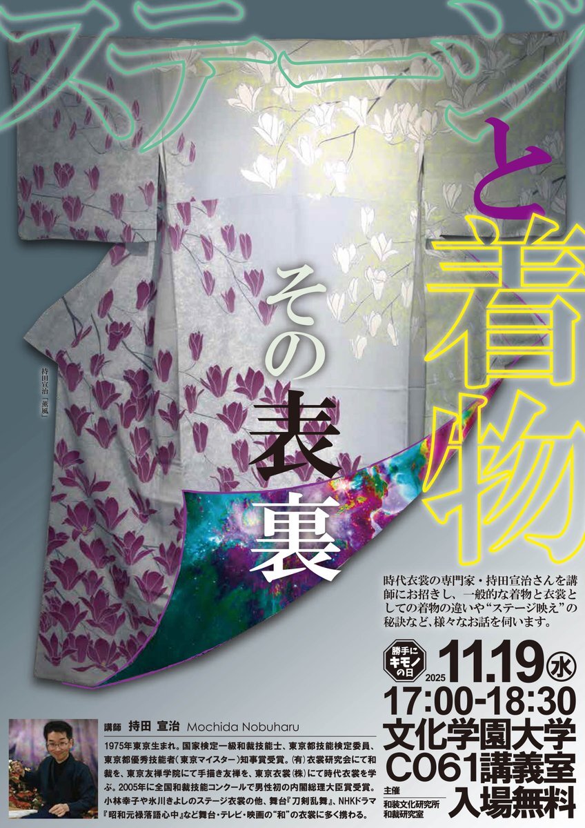 11/19(水)は勝手にキモノの日!今年は舞台・テレビ・映画で時代衣裳を製作されている持田宣治さんを講師に、ステージ映えする"和の衣裳"の秘訣を伺います!入場無料、皆さまぜひお越しください!#告知 #キモノ #文化学園大学 #コスチューム pic.x.com/prRIINbpIS