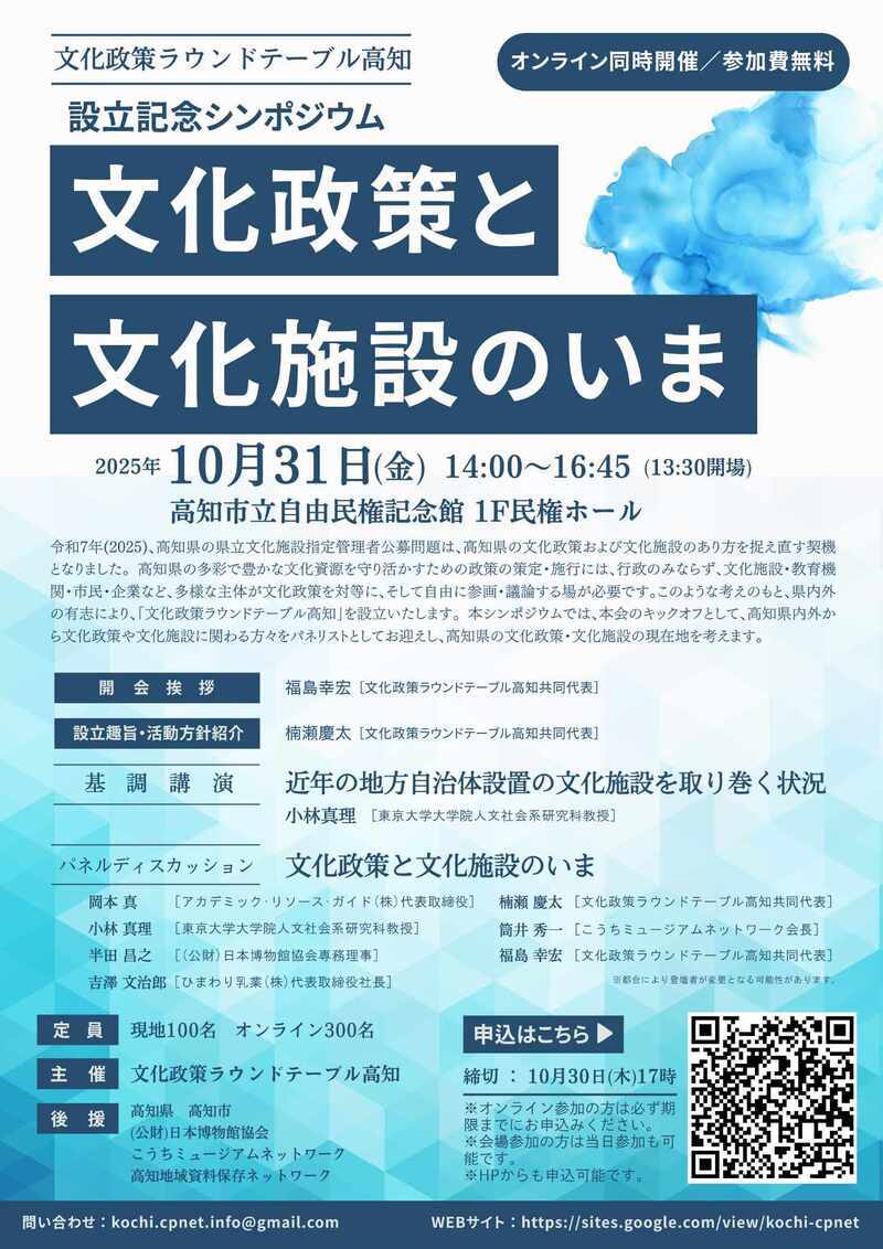 【#募集情報】 「文化政策ラウンドテーブル高知」設立記念シンポジウム開催!🎉 📅 10月31日(金) 14時より、高知県の #文化政策 や文化施設の在り方を考えるシンポジウムが開催されます! 詳細はチラシをご覧ください! 📝 参加の申込受付は10月30日(木) 17時まで! 🔗 申込フォームはこちら→ pic.x.com/Oj2mYktdxU