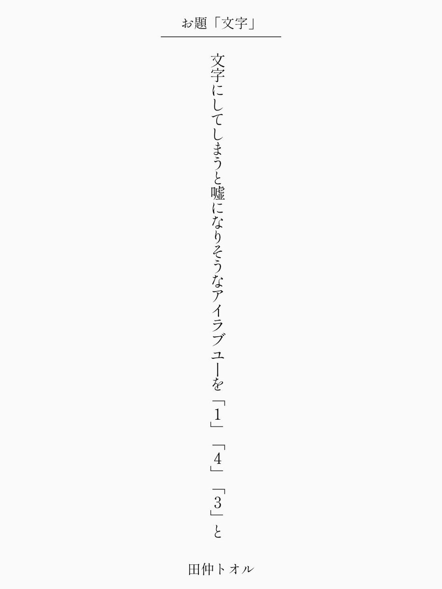 文字にしてしまうと嘘になりそうなアイラブユーを「1」「4」「3」と/田仲トオル #短歌 #文字・活字文化の日 #文字をテーマに短歌を作ろう pic.x.com/ZUrwBYkL93 x.com/tankazine/stat…