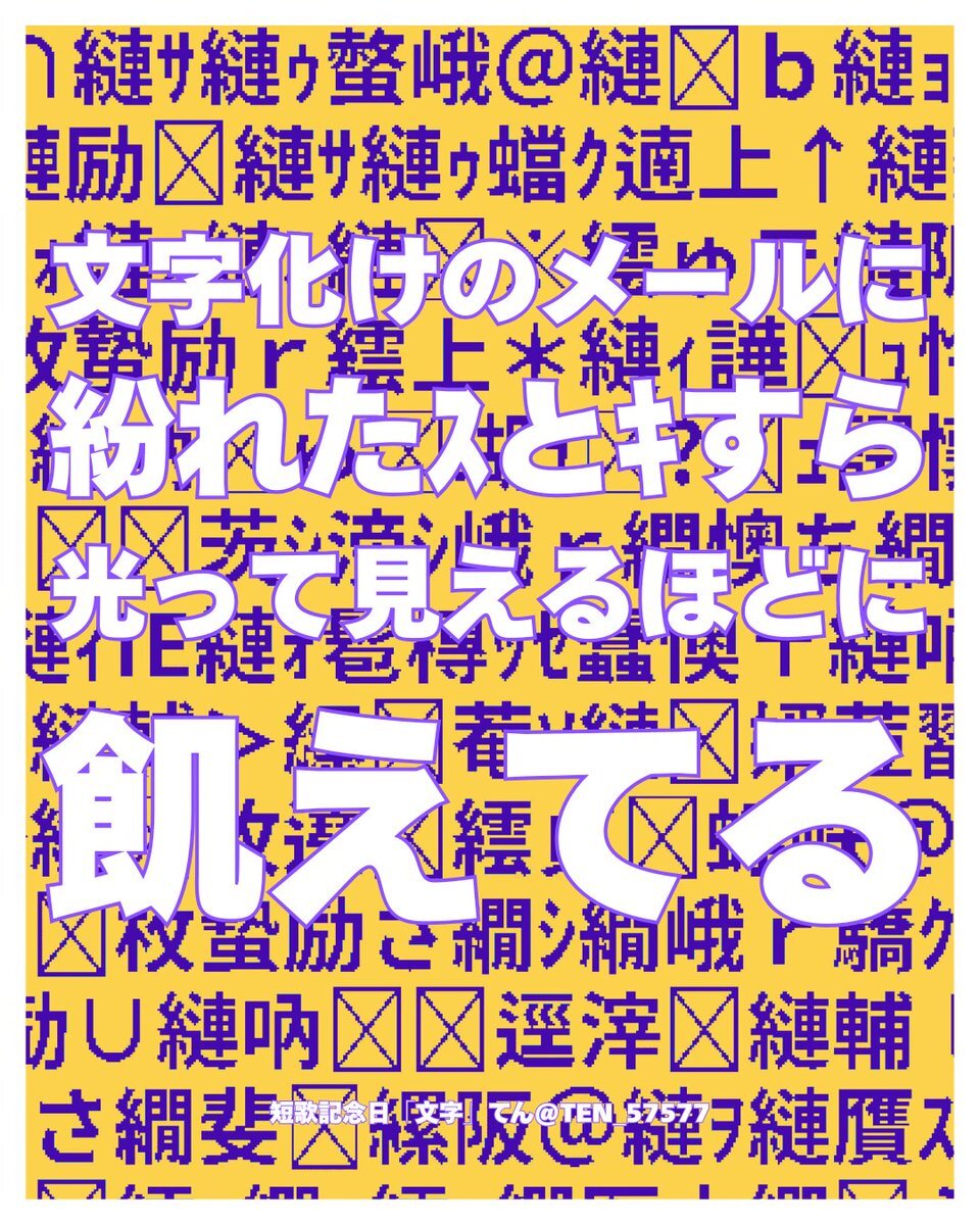 文字化けのメールに紛れたスとキすら光って見えるほどに飢えてる / てん #短歌 #文字・活字文化の日 #文字をテーマに短歌を作ろう pic.x.com/wHYqCRIWwD x.com/tankazine/stat…