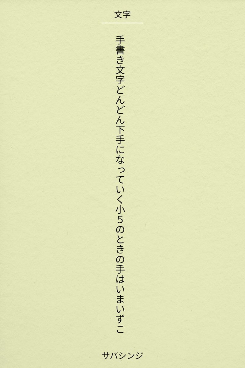 🌟【短歌記念日】 テーマ「文字」 10月27日 文字・活字文化の日 #短歌 #文字・活字文化の日 #文字をテーマに短歌を作ろう 手書き文字どんどん下手になっていく小5のときの手はいまいずこ / サバシンジ pic.x.com/B2uODnt4Hv x.com/tankazine/stat…
