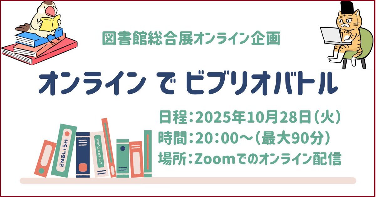 図書館総合展でオンラインのビブリオバトルやりますー。 「オンライでビブリオバトル」 豪華バトラー陣! みちねこさん(@heartfire0701 ) ダクシオンさん(@ducsion ) 図書館情報学を愛したいラジオさん(@libloveradio ) トクダ先生(@TokudaE1978 ) libraryfair.jp/forum/2025/1916 #図書館総合展