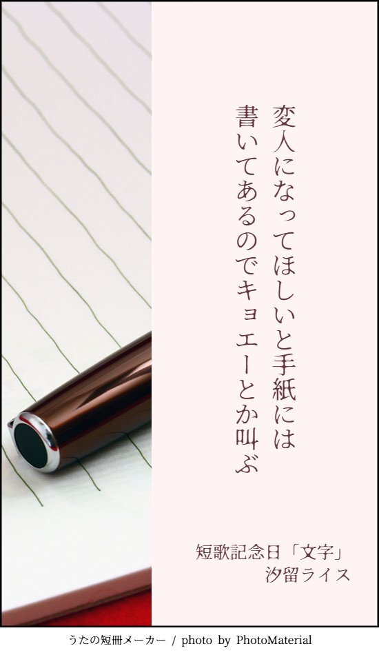 変人になってほしいと手紙には書いてあるのでキョエーとか叫ぶ/汐留ライス #短歌 #文字・活字文化の日 #文字をテーマに短歌を作ろう pic.x.com/OzlLTKw2Ir x.com/tankazine/stat…