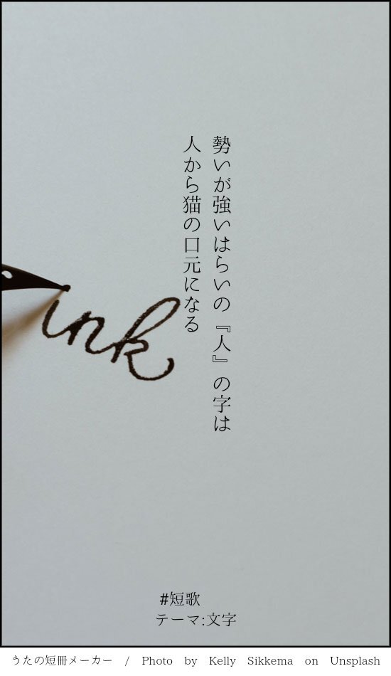 勢いが強いはらいの『人』の字は 人から猫の口元になる #短歌 #文字・活字文化の日 #文字をテーマに短歌を作ろう pic.x.com/MW0W6ZPrtm x.com/tankazine/stat…