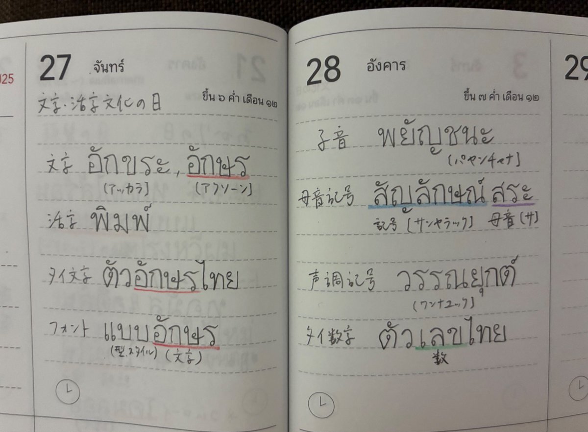 昨日10月27日は #文字・活字文化の日 でした。 私がタイ語を学び始めたのは3〜4年前。それ以前は模様のようにしか見えていなかったタイ文字が、文字として見えるようになり、区切りや音との関連が分かってきて、模様がいつの間にか言葉に変身しました🪄✨☺️ #まいにちふれるタイ語手帳 #タイ文字部 pic.x.com/sPBNjsf9qM
