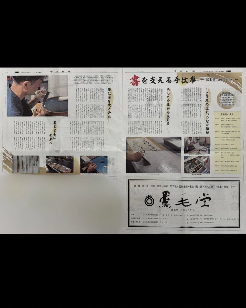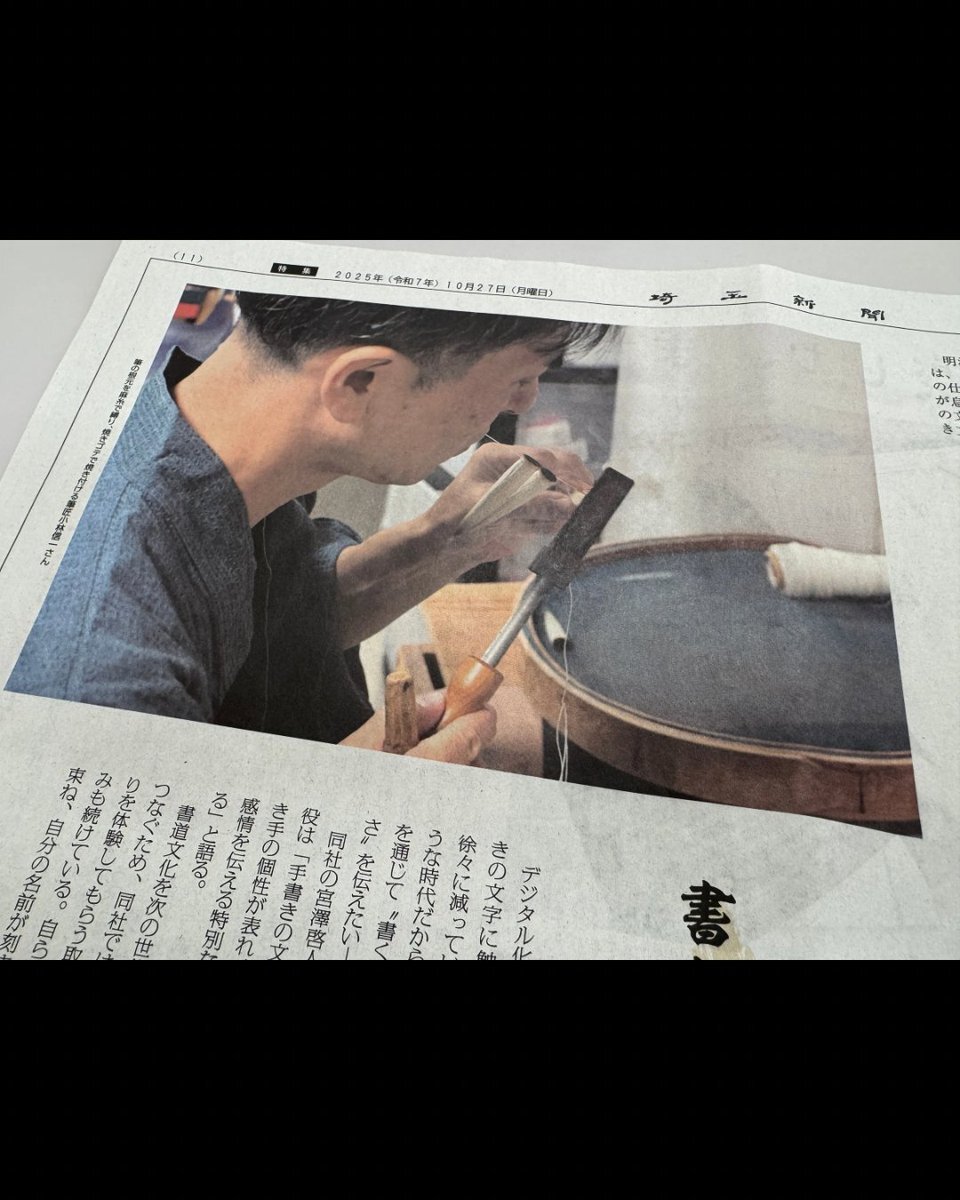📣特集 埼玉新聞様にて特集を組んでいただきました✨ 10月27日は 文字・活字文化の日 ということで 弊社の工房での手仕事を取り上げていただきました 埼玉から書道文化を支え続けていければと、日々精進しております! 埼玉新聞のロゴはあの先生の揮毫ですね☺️ #文字・活字文化の日 #埼玉新聞 pic.x.com/XgZX8QKjcM