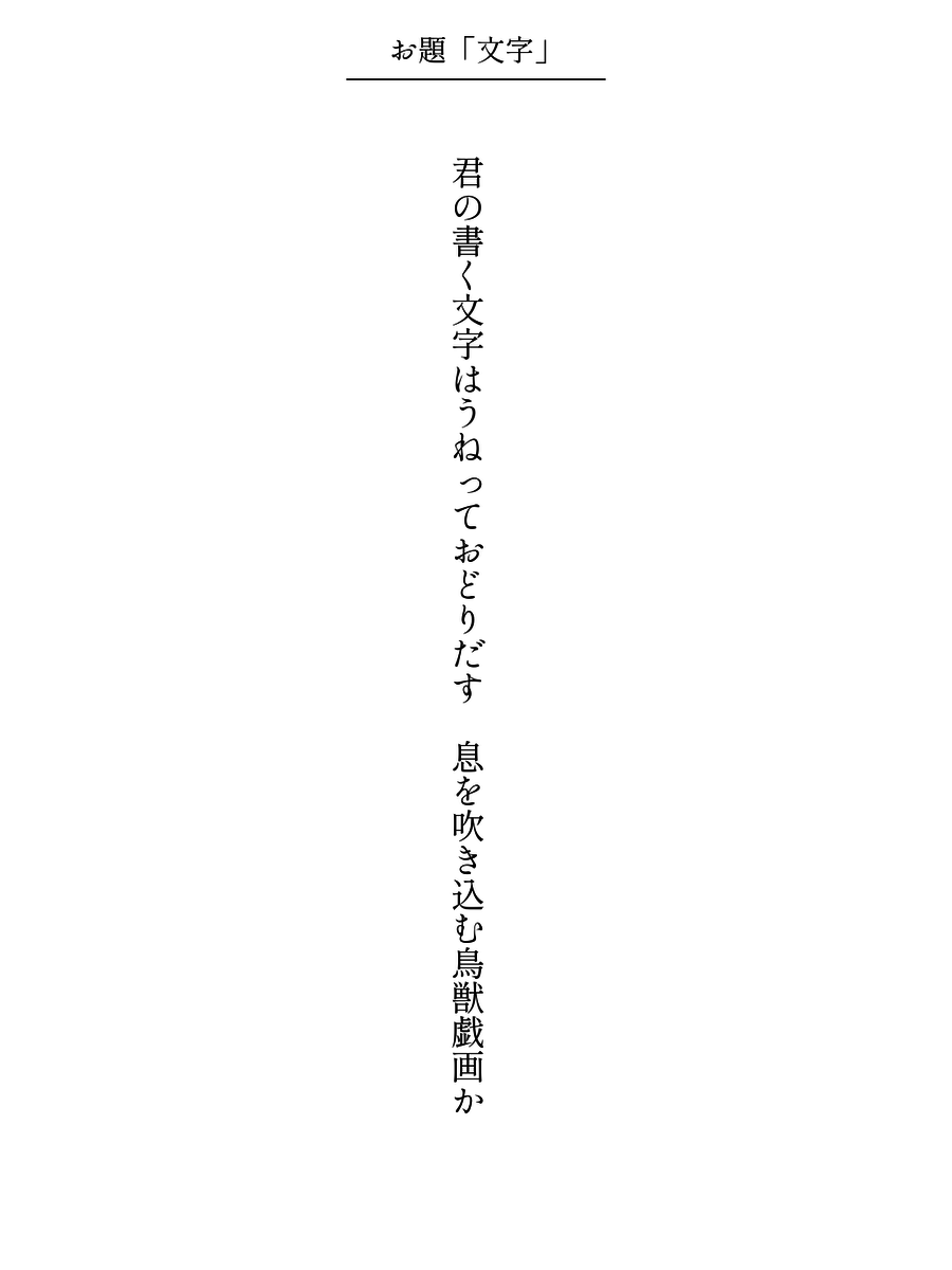 君の書く文字はうねっておどりだす 息を吹き込む鳥獣戯画か/ 土佐アヴァンチュールぱす汰 #短歌 #文字・活字文化の日 #文字をテーマに短歌を作ろう pic.x.com/B0ELyojUAh x.com/tankazine/stat…