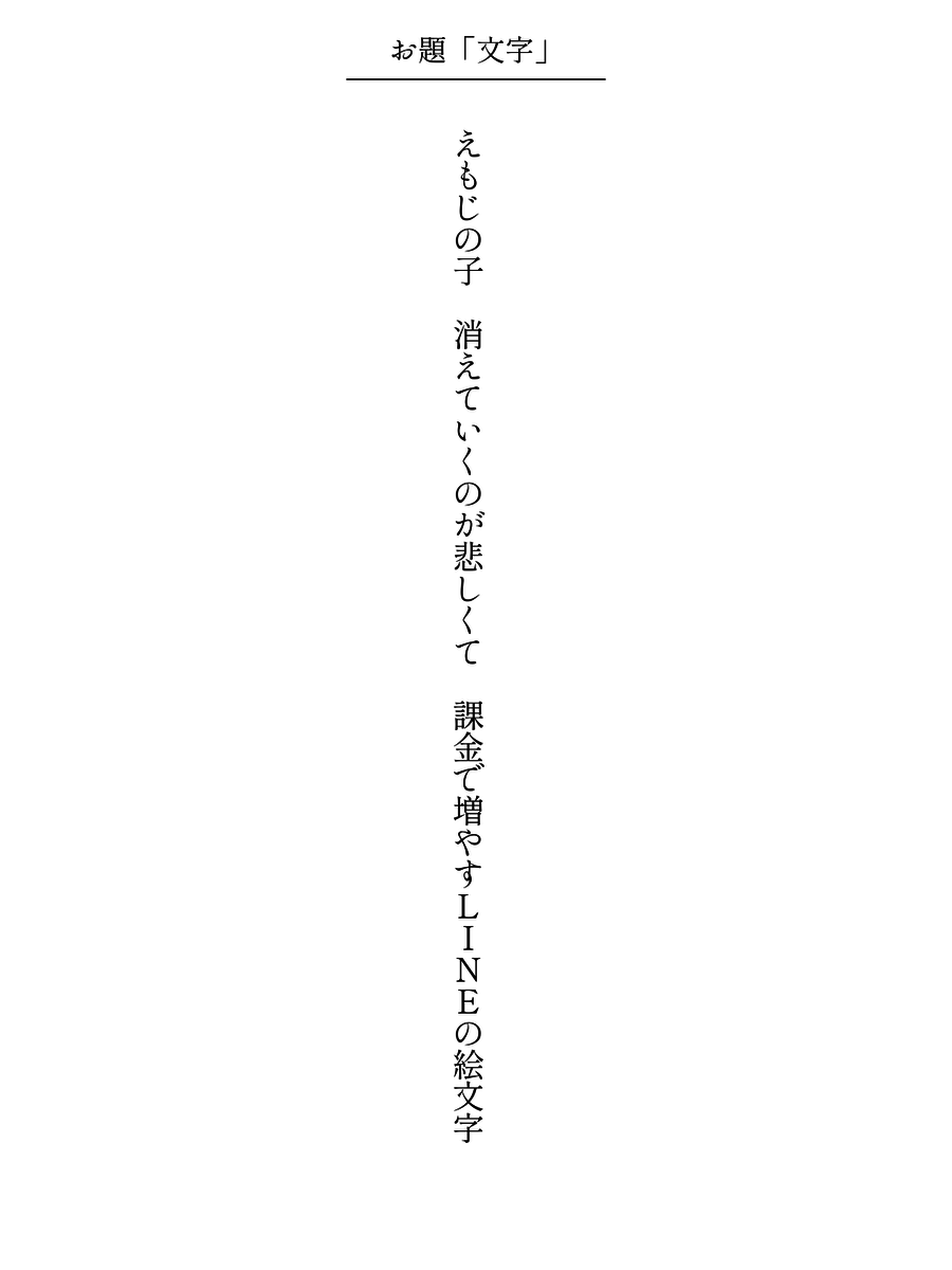 えもじの子 消えていくのが悲しくて 課金で増やすLINEの絵文字 #短歌 #文字・活字文化の日 #文字をテーマに短歌を作ろう pic.x.com/hQds86kzjo x.com/tankazine/stat…