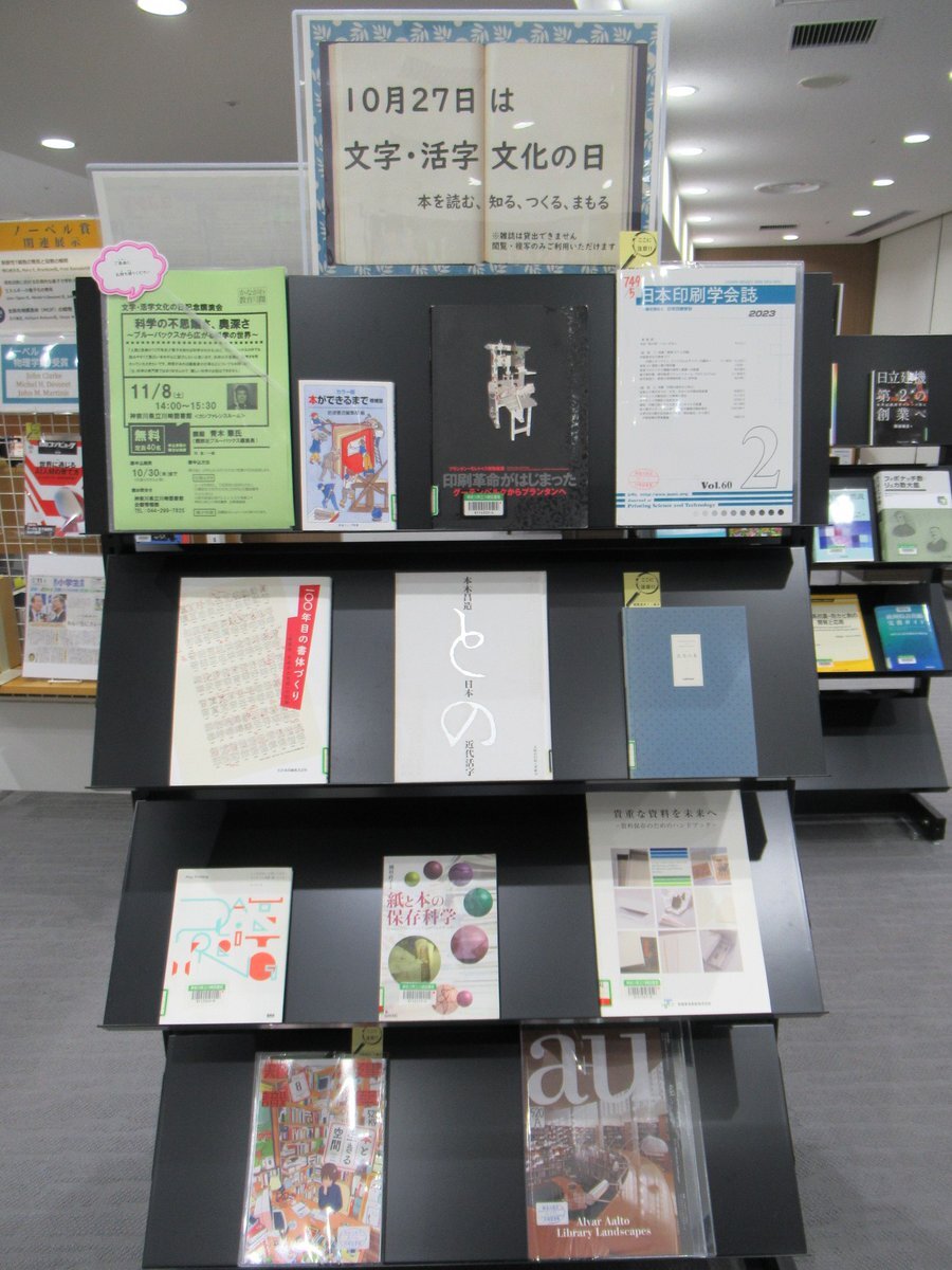 【閲覧室内ミニ展示「10月27日は文字・活字文化の日」】 「文字・活字文化の日」にちなみ、「本を読む、しる、つくる、まもる」をテーマに集めた当館の資料を展示しています。 (川崎)#川崎図書館 #文字・活字文化の日 klnet.pref.kanagawa.jp/kawasaki/exhib… pic.x.com/yjpBbltDbF