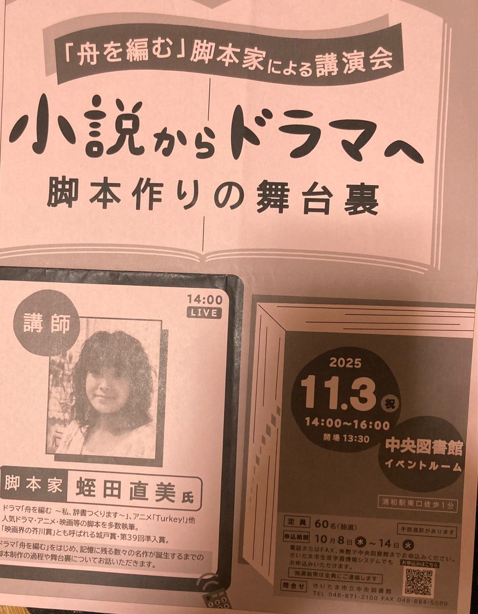 #文字・活字文化の日 だそうで浦和で開催された(毎年10月27日)記念講演へ行ってみた。小説からドラマヘ。(舟を編む)の脚本家 #蛭田直美 さん、約2時間、脚本制作の過程や舞台裏。参加者は当初60名が倍の120名に増。創作者、脚本家、さまざまな立場からの権利主張、正論、私論。ビジネス界隈の目論見。 pic.x.com/tnfm70eiSd