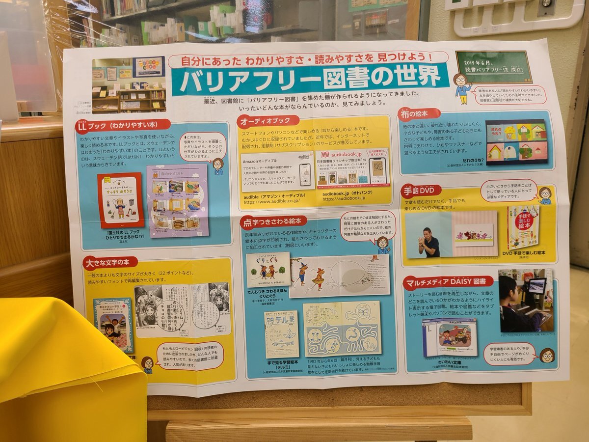 蒲郡市立図書館です。#文字・活字文化推進機構 様より、#読書バリアフリー体験セット をお借りしました。2階カウンター前に展示中です。実際に触って試してみてね。 #蒲郡 #図書館 #バリアフリー #すべての人に読書の楽しみを pic.x.com/0KJ6xGxJZE