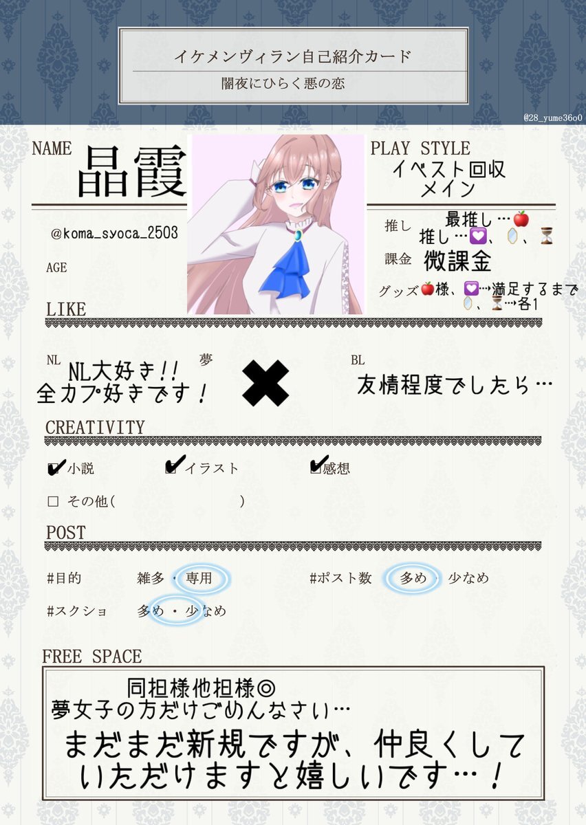 初めてのお友達探し🏷️ 一緒に推し活やイベントに参加できる友人やイケヴィラを語れる友達をください…! ♡中心にお迎えに行きます! #イケヴィラ自己紹介カード #イケヴィラ好きな人と繋がりたい #イケヴィラ好きさんと繋がりたい #文字書きさんと繋がりたい #絵描きさんと繋がりたい pic.x.com/F0q4p2LiNt