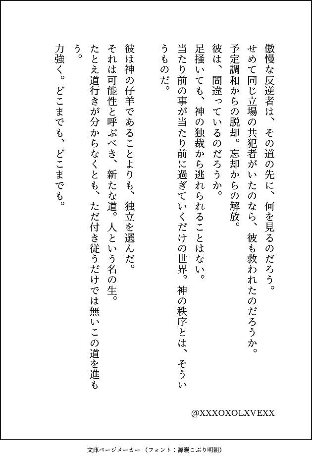 ひとりで空想することに飽きたらなくなったしがない文字書きです。 二次創作も一次創作もやります (2次は🌈🕒と歌い手中心に) いつか仲良しさんと合作するのが夢です!! #文字書きさんと繋がりたい #創作垢さんと繋がりたい #絵師さんと繋がりたい pic.x.com/8mW2bCvqvf