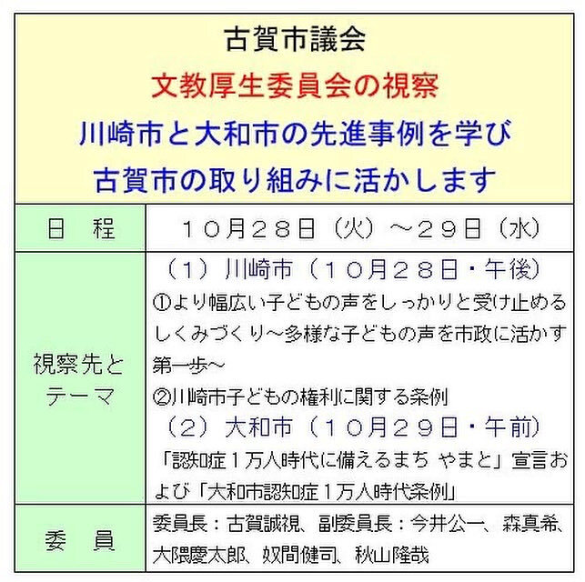 10月28日から29日にかけて文教厚生委員会は神奈川県川崎市と大和市の視察に行きます。子ども政策や認知症支援策を学び古賀市の取り組みに活かしたいと思います。 #古賀市 #ぬま健司 #文教厚生委員会 #大和市の認知症施策を視察 pic.x.com/9LtXjuYUxM