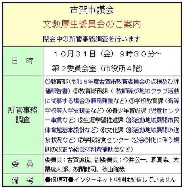 10月31日の9時30分から文教厚生委員会が開かれ、教育部各課の所管事務調査を行います。今回は来年度予算編成に向けた市長メッセージに盛り込まれた事業に着目しています。委員会は傍聴できますがインターネット中継は配信していません。 #古賀市 #ぬま健司 #文教厚生委員会 #閉会中所管事務調査 pic.x.com/y8jPqnZlb0