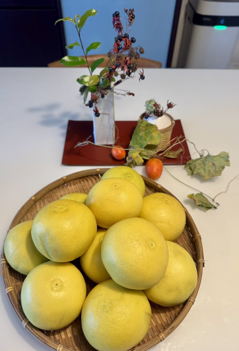 高知から文旦が届きました🍊 ハヤっと思ったら温室育ちだそうです😊 小ぶりだけど良い香り、メッチャ甘くて感激です😄 夜はレタス半分と野菜と豚の蒸し煮。これも簡単で美味しいのです😅 #文旦 #メゾンドショコラ #ガトーショコラ #ボンは食べれない #焼き栗とさつまいものパン pic.x.com/ewZggOEnW7