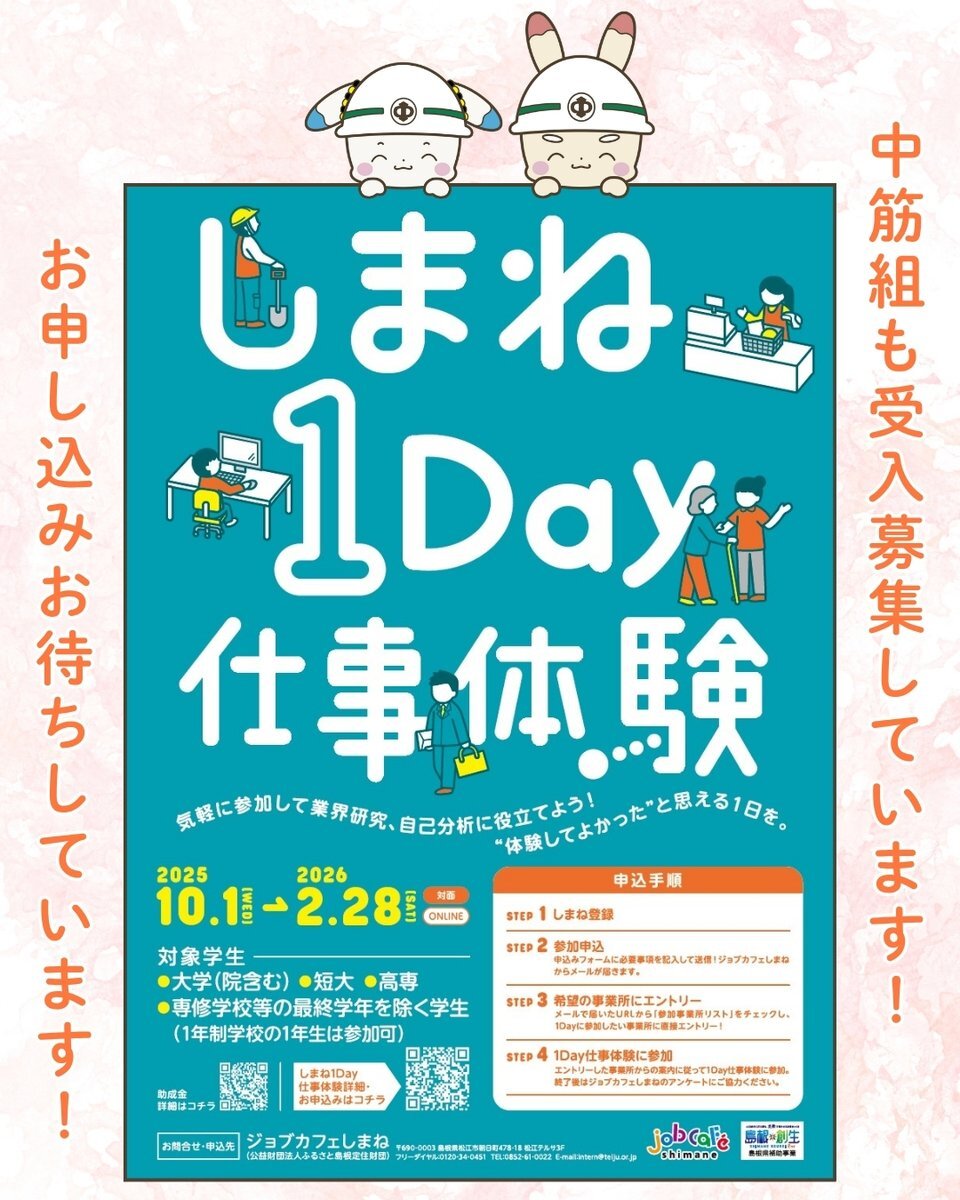【📢#しまね1Day仕事体験 受付開始】 中筋組でも「しまね1Day仕事体験」の受入れを募集しています! ご参加をお待ちしております♪ 詳細はジョブカフェしまねのサイトよりご確認ください。 option.gogo-jobcafe-shimane.jp/shigototaiken_… #島根県 #出雲市 #建設業 #就活 #文理不問 #27卒 #仕事体験 #オープンカンパニー pic.x.com/y73IZp73qJ