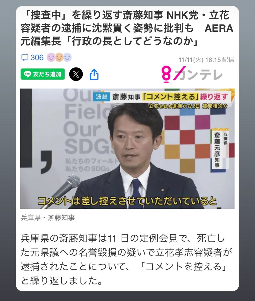 斎藤知事「SNSの適正利用を県民に呼びかける」 立花容疑者逮捕で主な一問一答 kobe-np.co.jp/news/society/2… 「NHKから国民を守る党」党首の立花孝志容疑者が名誉毀損の疑いで逮捕されたことを受け、県の合同防災訓練に出席していた兵庫県の斎藤元彦知事が9日、記者団の取材に応じた。