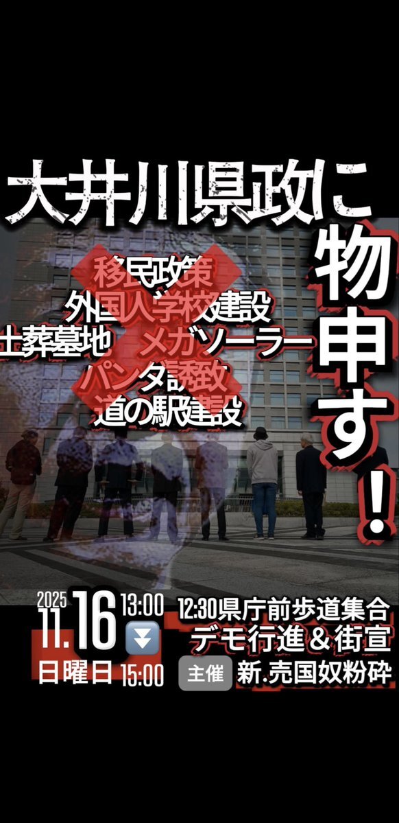 茨城県の皆様デモありますよ! 大井川県政に物申す! デモ行進&街宣 11/16日(日)13:00〜15:00開催です! 12:30茨城県庁前集合 #高市やめろ #斎藤元彦の逮捕まだですか #改憲発議阻止デモ #ヤバすぎる緊急事態条項 x.com/boyaki_daichi/…