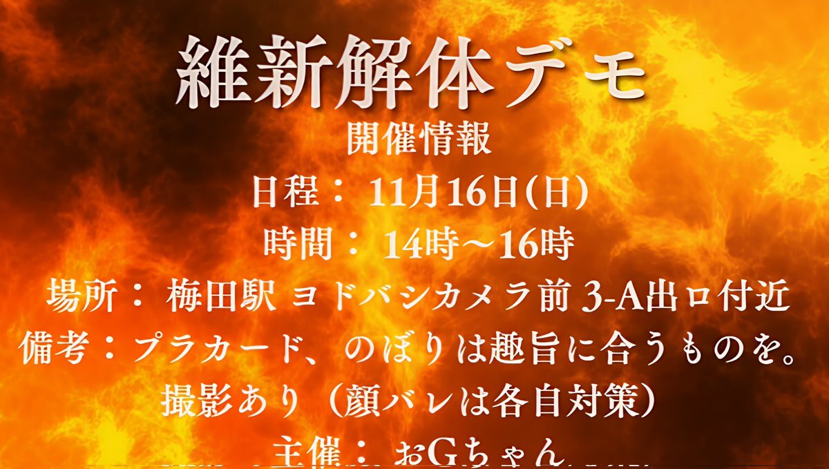 維新解体デモ 開催情報 日程:11月16日(日) 時間:14時~16時 場所:梅田駅 ヨドバシカメラ前 3-A出ロ付近 備考:プラカード、のぼりは趣旨に合うものを。 撮影あり(顔バレは各自対策) 主催: おGちゃん